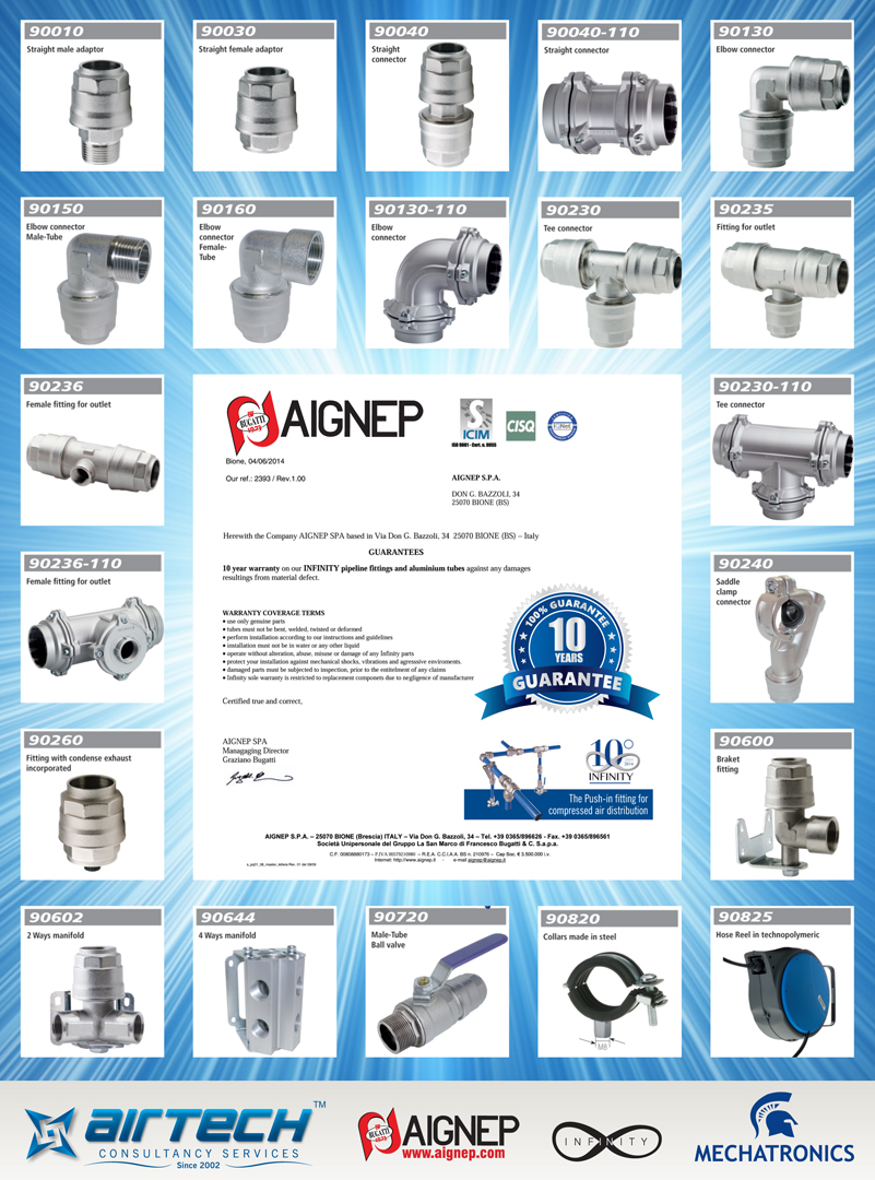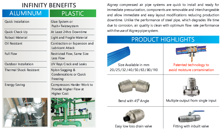 Aignep compressed air pipe systems are quick to install and ready for immediate pressurization, components are removable and interchangeable and allow immediate and easy layout modifications reducing production downtime. Unlike the performance of steel pipe, which degrades life time due to corrosion, air quality is clean with optimum flow rate performance withthe use of Aignep pipe system.